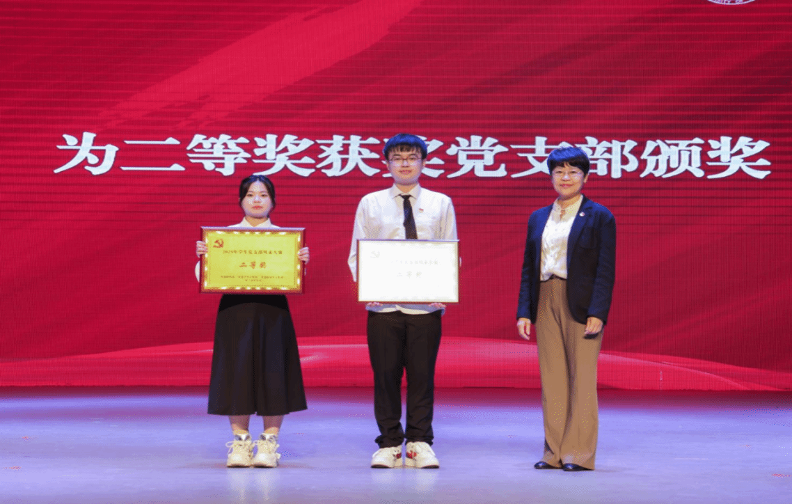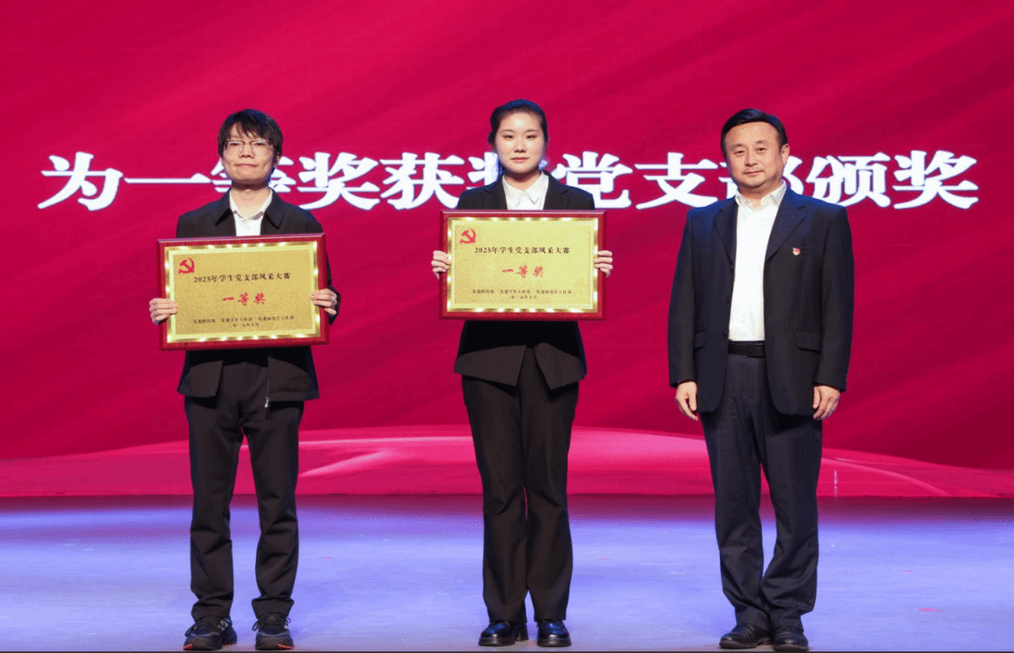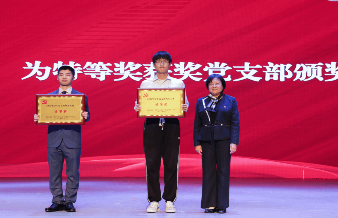 陈文武、学校办公室主任张玮、纪委副书记唐勤分别为获得特等奖、一等奖、二等奖的学生党支部颁奖。