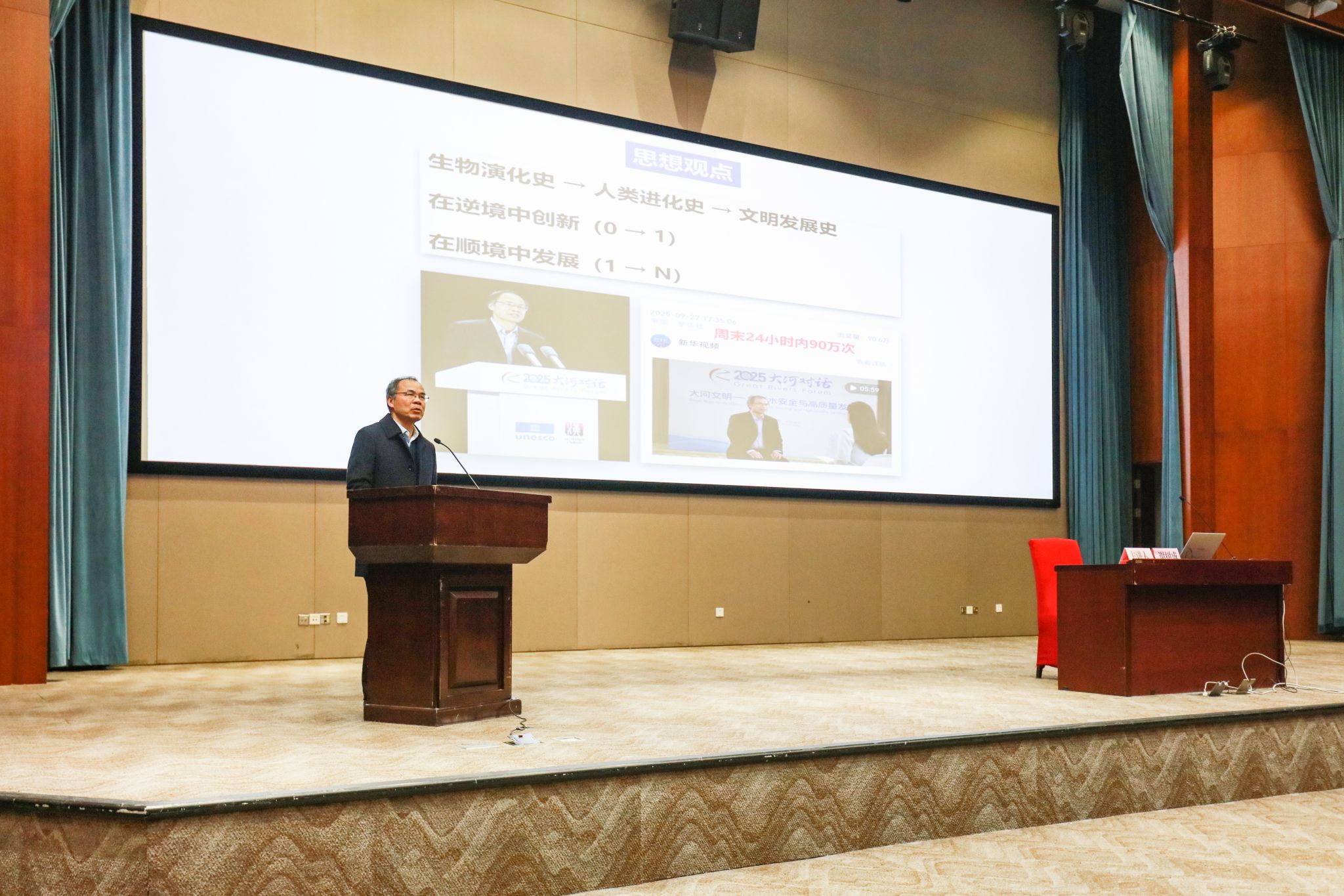 师生共同聆听了“地韵文旅讲堂暨震旦讲坛”。谢树成以《生命的常态:逆境中的创新》为题,为师生带来了一场跨越时空的科普盛宴。他结合长江地质演化史与生态保护案例,深刻阐释了“压力激发创新”的科学规律,引导青年学子从长江生态系统的生生不息中汲取智慧,将个人成长融入国家战略。现场学生与谢院士亲切交流,共同探讨了专业学习与个人志向的关系。