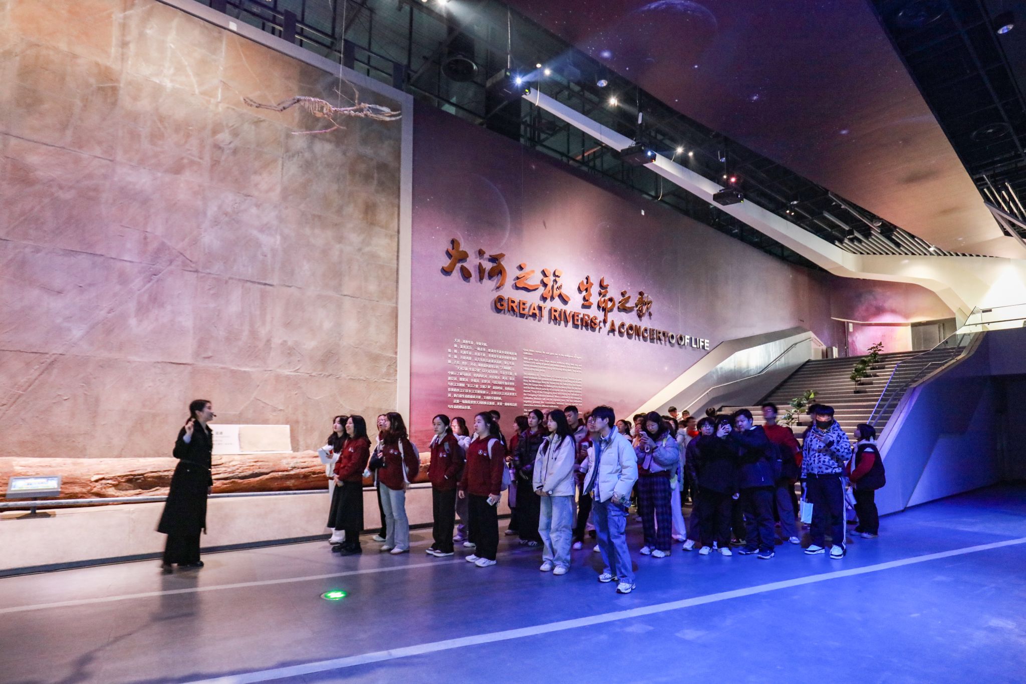 讲座结束后,师生集体开展了研学考察。在长江文明馆,师生们循着历史脉络有序参观,通过文物实物、场景复原、多媒体交互等多元展陈形式,沉浸式触摸长江流域百万年人类演进的足迹、一万年文化发展的脉络与五千年文明传承的精髓。从远古先民的生存智慧,到荆楚文化的独特魅力,再到长江经济带的时代新篇,一幅幅文明画卷徐徐铺展。在贝林大河生命馆,极具视觉冲击力的生物标本、生态场景复原与生命演化科普展项,生动呈现了长江流域乃至全球大河的生态系统与生命奇观,让师生直观领略到万物共生的自然之美,深刻认识到河流生态对于文明存续的重要意义。