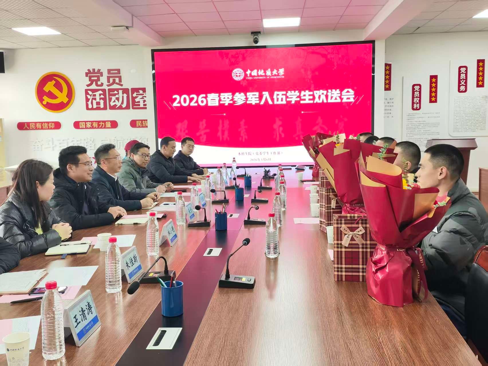 3月6日下午2:30,我校2026年春季参军入伍学生欢送会在本科生院501会议室举行,校党委副书记王甫,党委学工部部长、武装部部长朱丹,相关学院党委副书记、辅导员,学生思想政治教育办公室(含军事理论教研室)相关负责老师,全体参军入伍学生参加座谈。会议由朱丹主持。
