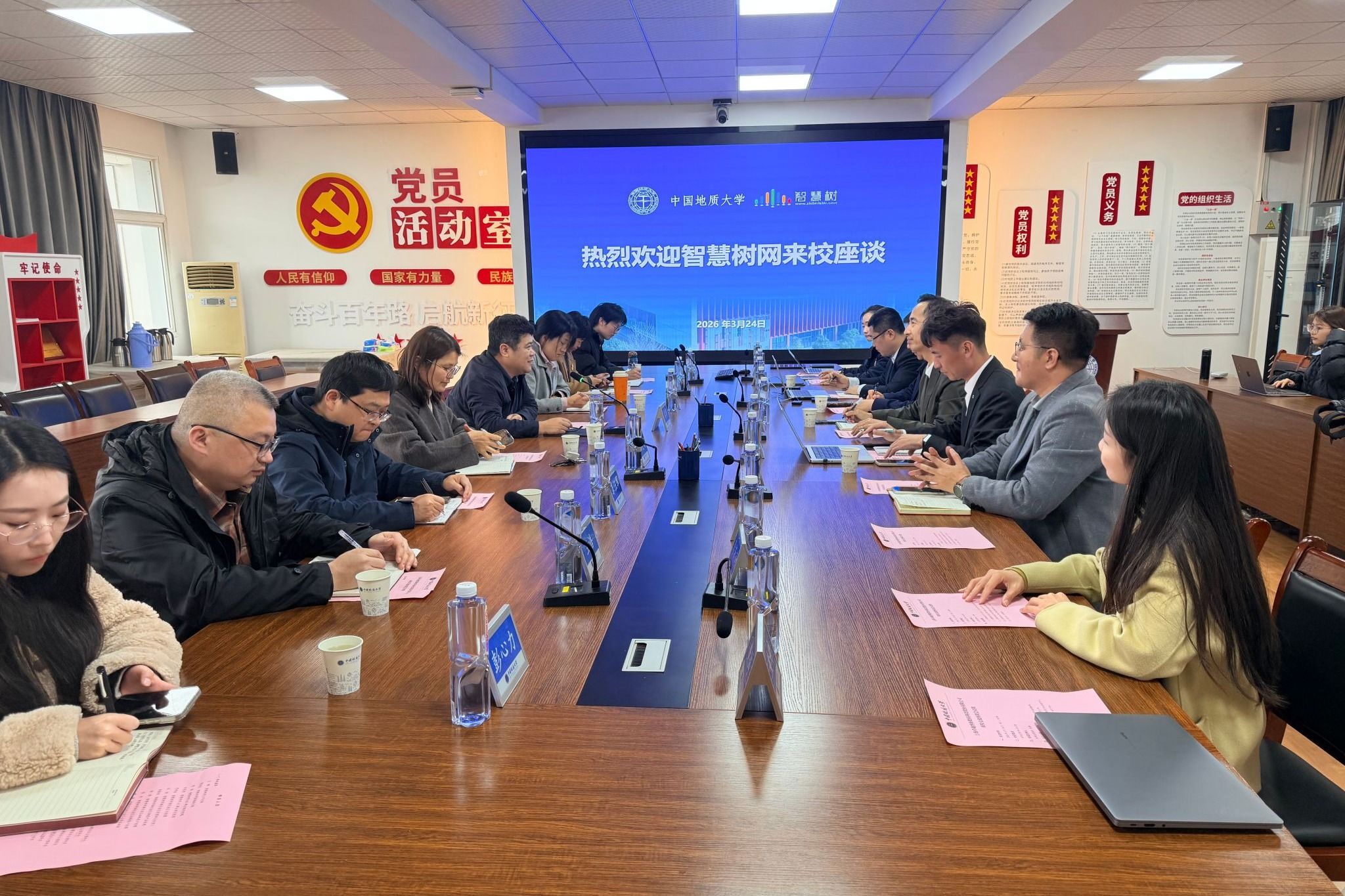 会上,智慧树网王晖总裁汇报了2026年公司的重点工作方向及校企合作创新方向,知识图谱事业部总经理钱海就学校的智慧慕课建设、专业创新中心建设建设两个方面做了汇报,AI事业部总经理朱冠亮对AI一体化平台进行了汇报。