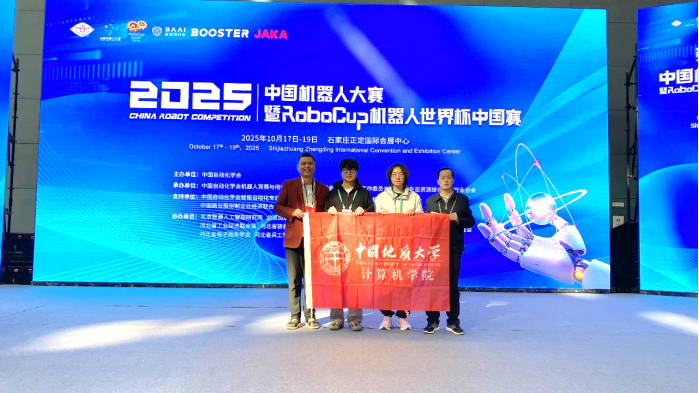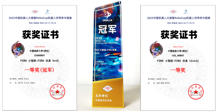 (通讯员:王之圻、朱致远)10月17日-19日,2025年中国机器人大赛暨RoboCup机器人世界杯中国赛决赛在石家庄国际会展中心浓重举行。大赛由中国自动化学会主办,河北省生态资源综合利用行业协会承办,旨在推动机器人技术前沿研究,促进产学研深度融合,为机器人和AI领域培育更多高水平创新型人才。我校CUGROBOT代表队由金牌教练杨林权老师和罗忠文老师指导,夏宇轩、王之圻、朱致远、刘培、盛梁和陈邦朴等同学组成的机器人足球代表队。经过三天的激烈竞争,该团队成功卫冕了FIRA小型组-FIRA仿真5vs5赛项冠军,FIRA小型组-FIRA仿真11vs11比赛获得第四名,两项国家级一等奖。