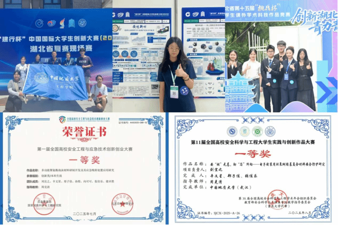 这份“越挫越勇”的韧劲,终于换来了硕果累累:第十一届全国高校安全科学与工程大学生实践与创新作品大赛国家级一等奖、第一届全国高校安全工程与应急技术创新创业大赛国家级一等奖、2025年中国国际大学生创新大赛国家级铜奖……一系列国家级奖项,不仅是对项目创新性的认可,更证明了她“把学术融入实践”的能力。其项目还成功入选2025年度湖北省大学生创业扶持项目创意组“金点子”项目,朝着产业化落地稳步迈进。