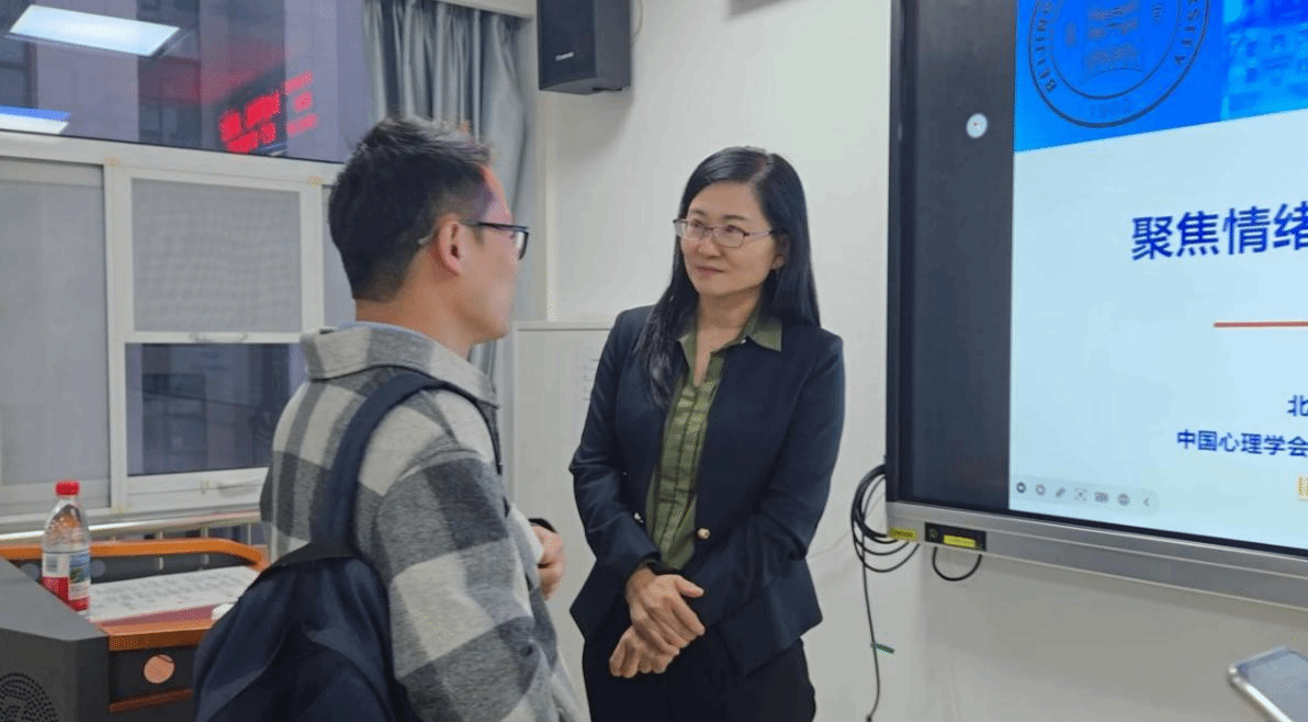 在交流互动环节,教师就亲子教育困惑提问,蔺教授从情绪聚焦的视角给出了 “多肯定孩子非成绩维度的付出与品质、将成绩与孩子的努力挂钩” 等建议;心理中心专咨询员就家庭治疗的结束标准、咨询中沟通遇阻的应对策略等专业问题进行请教,蔺教授予以细致解答,现场交流氛围热烈。