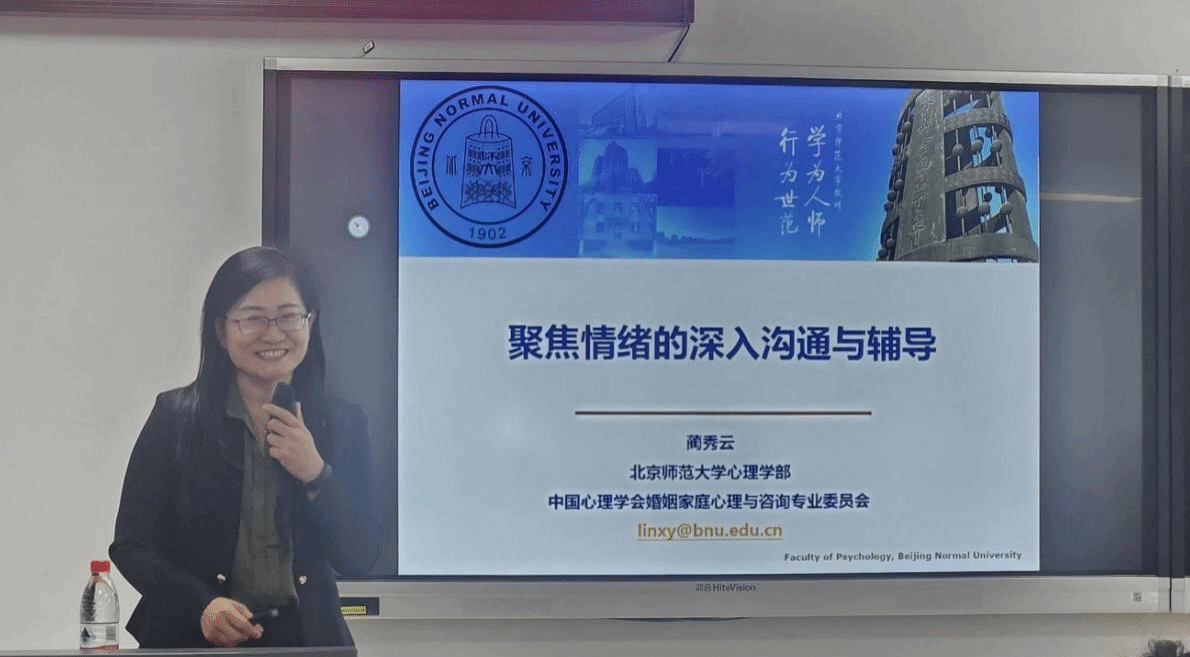 讲座伊始,蔺秀云教授结合高校心理健康工作中常见的恋爱冲突、亲子冲突等案例,指出深度情绪沟通在限时心理辅导工作中的重要性,明确了本次讲座 “快速”提升情绪沟通能力、助力建立有效辅导关系” 的核心目标。